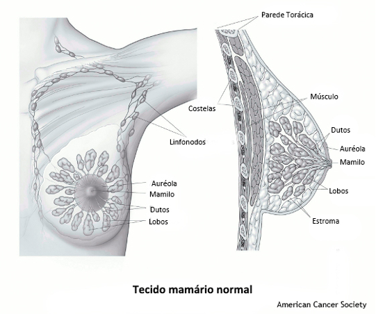 A mama feminina é composta por lobos (glândulas produtoras de leite), por ductos (pequenos tubos que transportam o leite dos lobos ao mamilo) e por estroma (tecido adiposo e tecido conjuntivo que envolve os ductos e lobos além de vasos sanguíneos e vasos linfáticos).